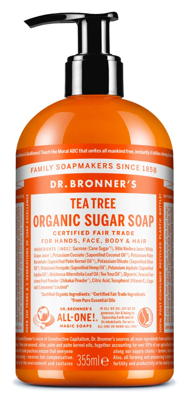 Dr. Bronner's Tea Tree Zeeppomp is lief voor lichaam en planeet! Fair trade & biologische suiker geeft onze biologische Shikakai zeep een rijke caramelkleur en zoete geur. De suiker is gecombineerd met druivensap om je huid gevoed, gehydrateerd en soepel te houden. Biologische kokos-olijven-hennep oliën zorgen voor een romig castille schuim & onze zeepmaak traditie! Perfect voor wie houdt van natuurlijke, veelzijdige reiniging en bewust kiest voor fair trade en duurzame ingrediënten.