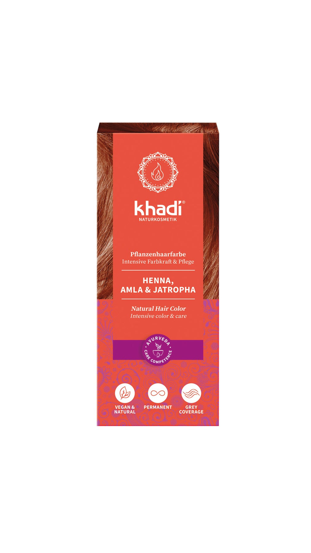 Khadi Henna, Amla & Jatropha verft uw haar in een sterk lichtrood tot opvallend diep donkerrood. Deze 100% plantaardige en veganistische haarkleur geeft intensieve koperrode nuances tot diep mahonie. Het resultaat varieert per startkleur: medium blond tot donker haar glanst in koperrood tot mahonie, donkerbruin tot zwart haar krijgt een glinsterende rode reflex. Door de intensievere werking van Amla en Jatropha ontwikkelen de kleuren zich sterker dan bij pure henna. De kleur bedekt ook grijs haar.