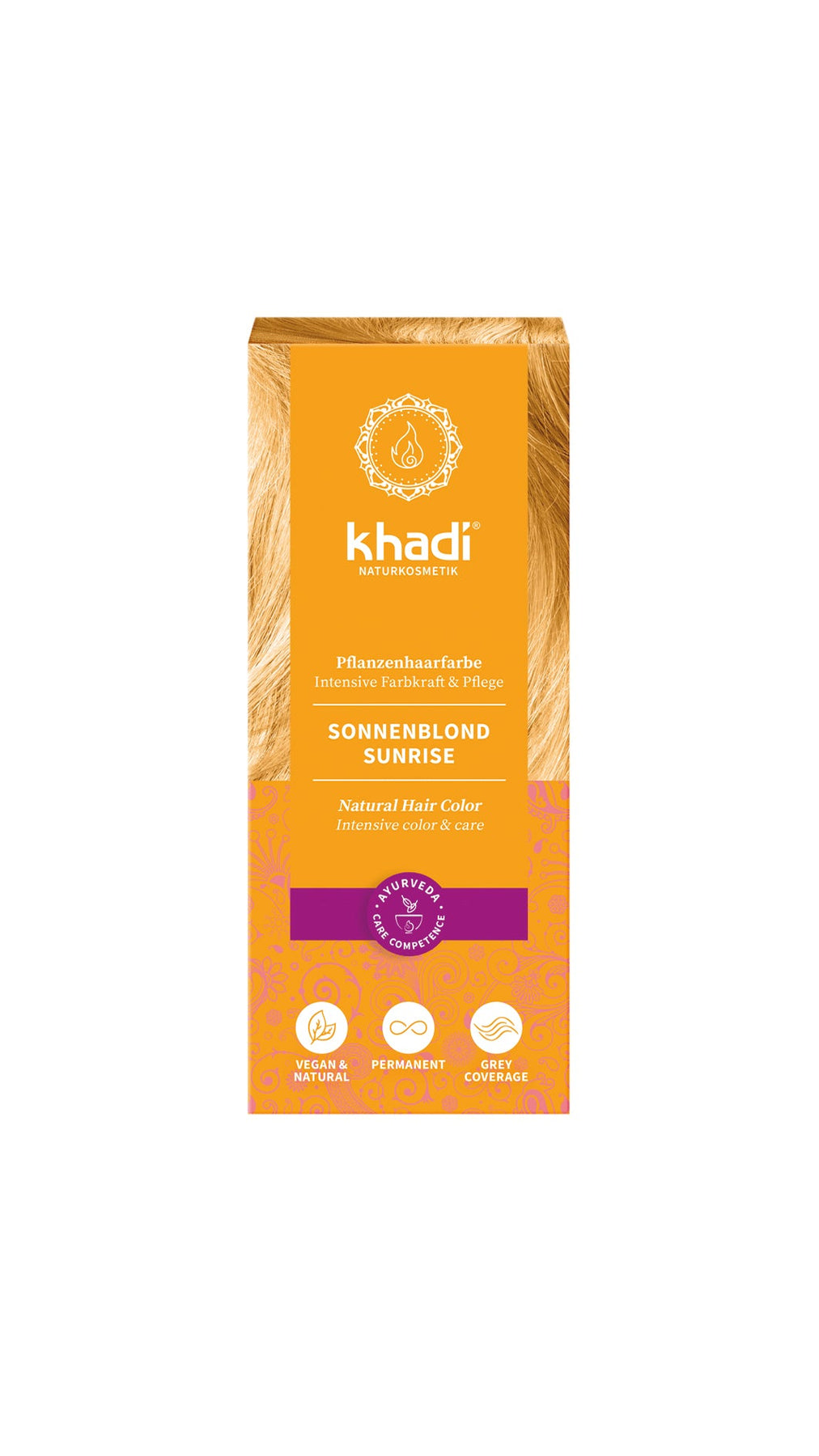 Khadi Sun Blonde kleurt uw haar in een krachtig, warm blond effect – een vleugje zomer in je haar. Deze 100% natuurlijke en veganistische haarkleur is vrij van synthetische ingrediënten. Het resultaat varieert per startkleur: licht haar krijgt een glanzend honingblond tot sterk, zomers zonneblond, donker haar krijgt gouden tot delicate roodachtig gouden reflecties met bijzondere glans. De kleur bedekt ook grijs haar op een voedende manier in warm, zonnig, glanzend blond. Let op: Khadi Sun Blonde heeft geen oplichtend effect, maar bouwt voort op uw oorspronkelijke haarkleur.