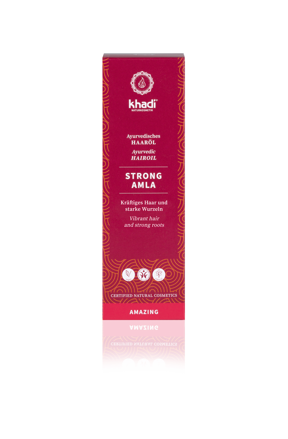 Khadi Strong Amla Haarolie is een conditionerende behandeling voor het wassen die helpt om de elasticiteit van het haar te verbeteren, de wortels te versterken en te voeden, en het haar van de wortels tot de punten te herstellen, waardoor je haar levend, sterk en zacht aanvoelt met een heerlijke, gezonde glans. De Strong Amla Hair Oil is een diepe conditionerende natuurlijke haarbehandeling op basis van een Ayurvedische formule die rijk is aan actieve ingrediënten, waaronder brahmi en bhringaraj, tropische kruiden waarvan is aangetoond dat ze haaruitval voorkomen, de haarwortels versterken en vroegtijdig grijs worden van het haar helpen voorkomen. Omega-rijke zonnebloem-, sesam- en amandelolie en vitamine E helpen allemaal haarbreuk te voorkomen.