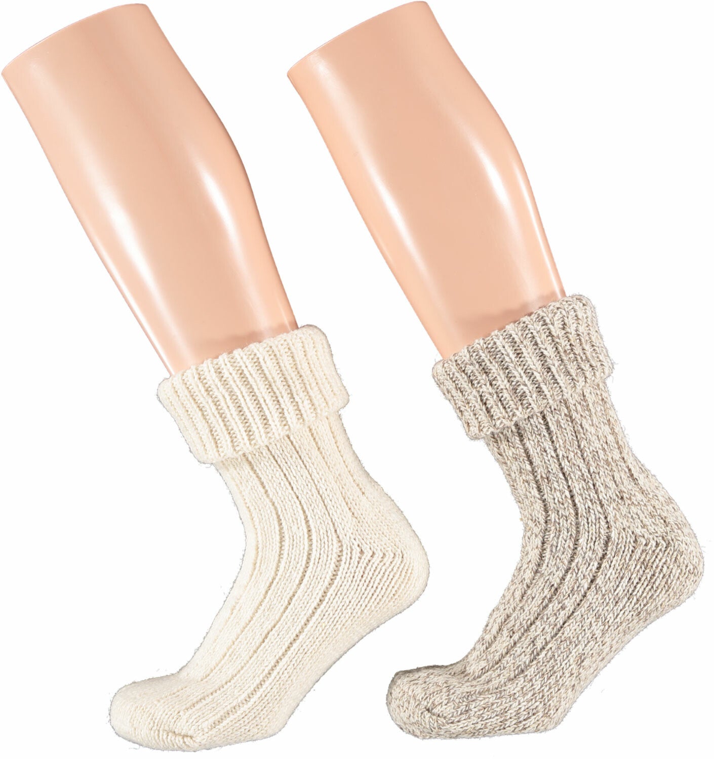 2 paar wollen dames huissokken met zeer breed boord waardoor deze langer te dragen zijn of met een omslag . Gemaakt van 30% schapenwol, 50% acryl, 18% polyamide en 2% elastaan