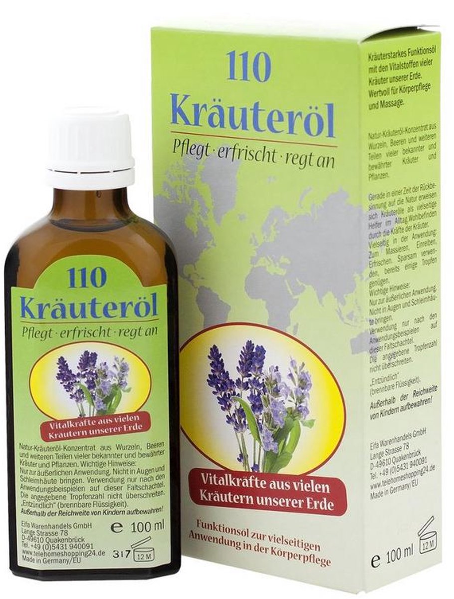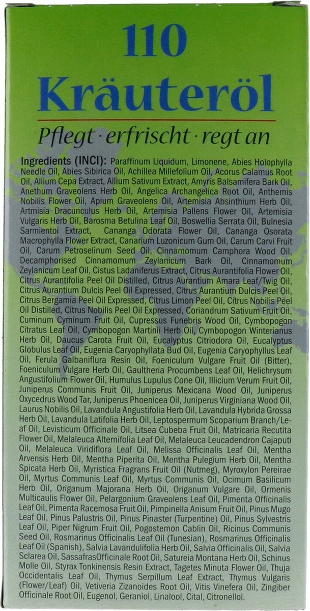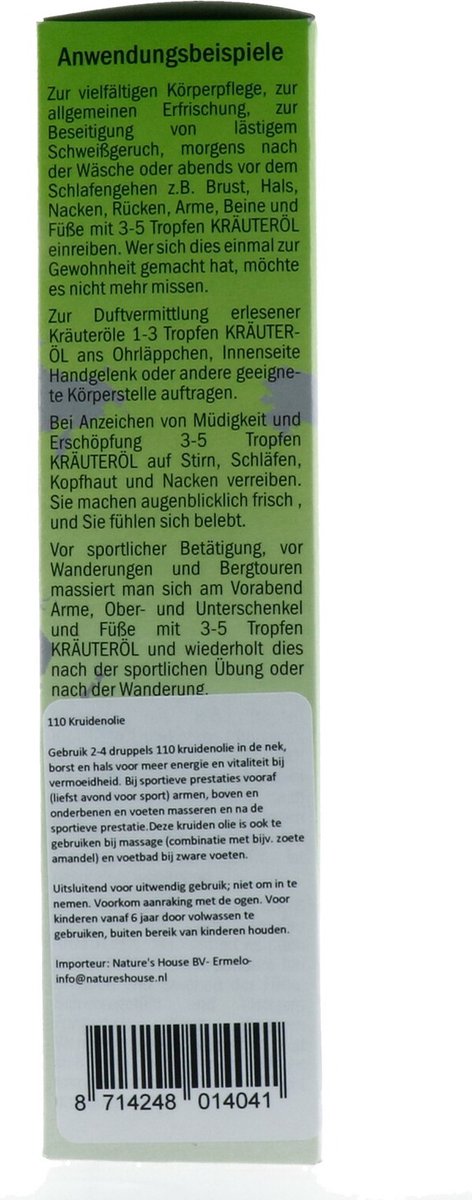 Gebruik 2-4 druppels 110 kruidenolie in de nek, borst en hals voor meer energie en vitaliteit bij vermoeidheid. Bij sportieve prestaties vooraf (liefst avond voor sport) op armen, boven- en onderbenen en voeten masseren en na de sportieve prestatie. Deze kruidnolie is ook te gebruiken bij massage (combinatie mmet bijv. zoete amandel) en als voetenbad bij zware voeten.